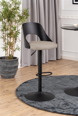 Lucy barstolen kombinerer luksus og funktionalitet i et elegant design. Med en komfortabel polstring i sandfarvet Malmo stof og et sortbejdset sæde i egefiner får du en stilfuld barstol, der passer perfekt til både køkkenøer og hjemmebarer. Stolens trompetformede stel i mat sort ru pulverlakeret stål sikrer stabilitet og holdbarhed, mens den integrerede drejefunktion og gaspatron giver maksimal fleksibilitet.
