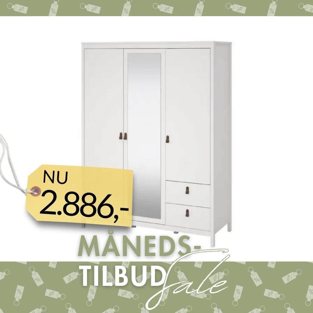 Opgrader dit soveværelse med Madrid garderobeskabet i hvid. Dette rummelige og moderne skab er designet til at imødekomme dine opbevaringsbehov med tre låger, hvoraf den ene har et elegant spejl, to skuffer samt en fleksibel kombination af hylder og bøjlestang.