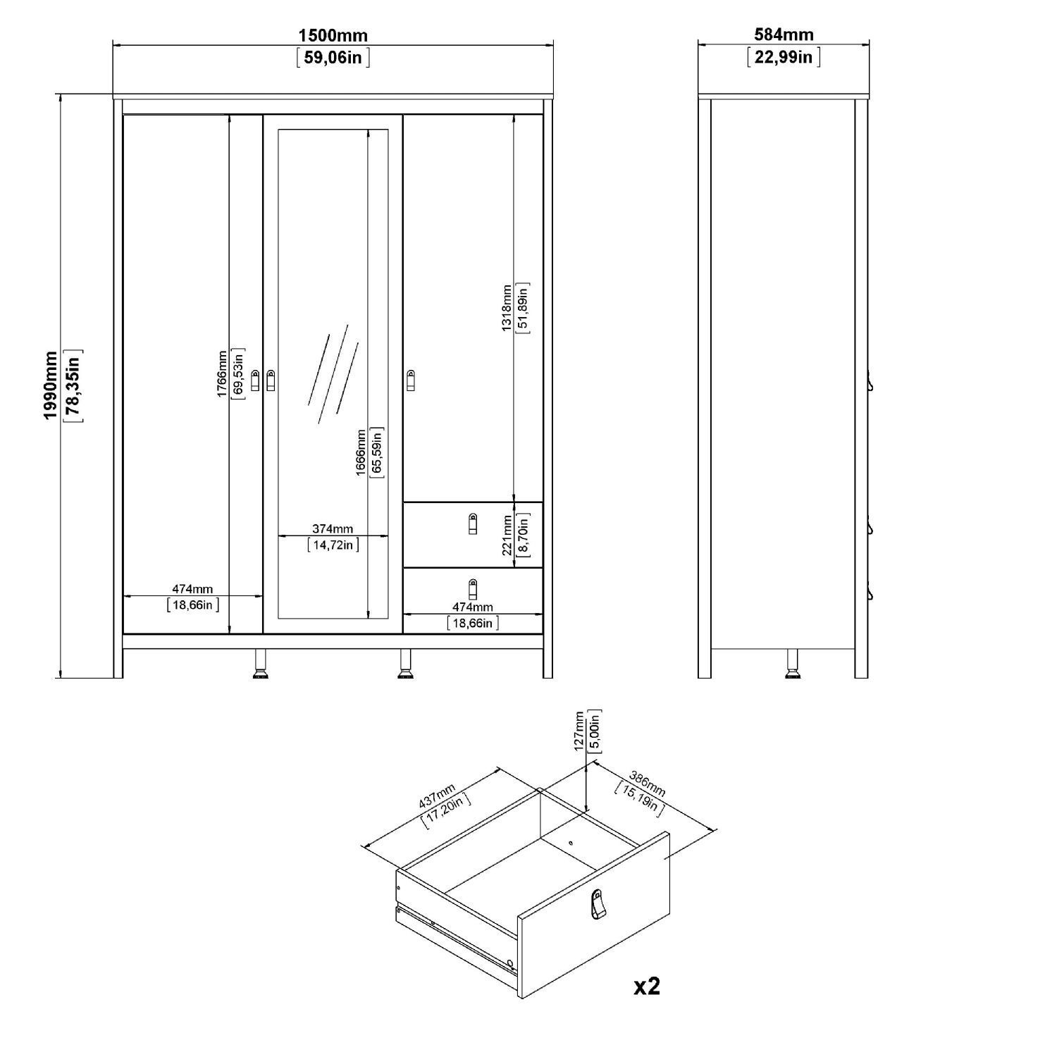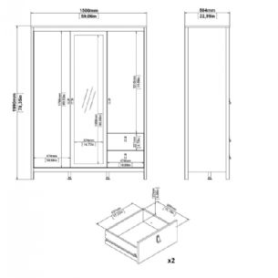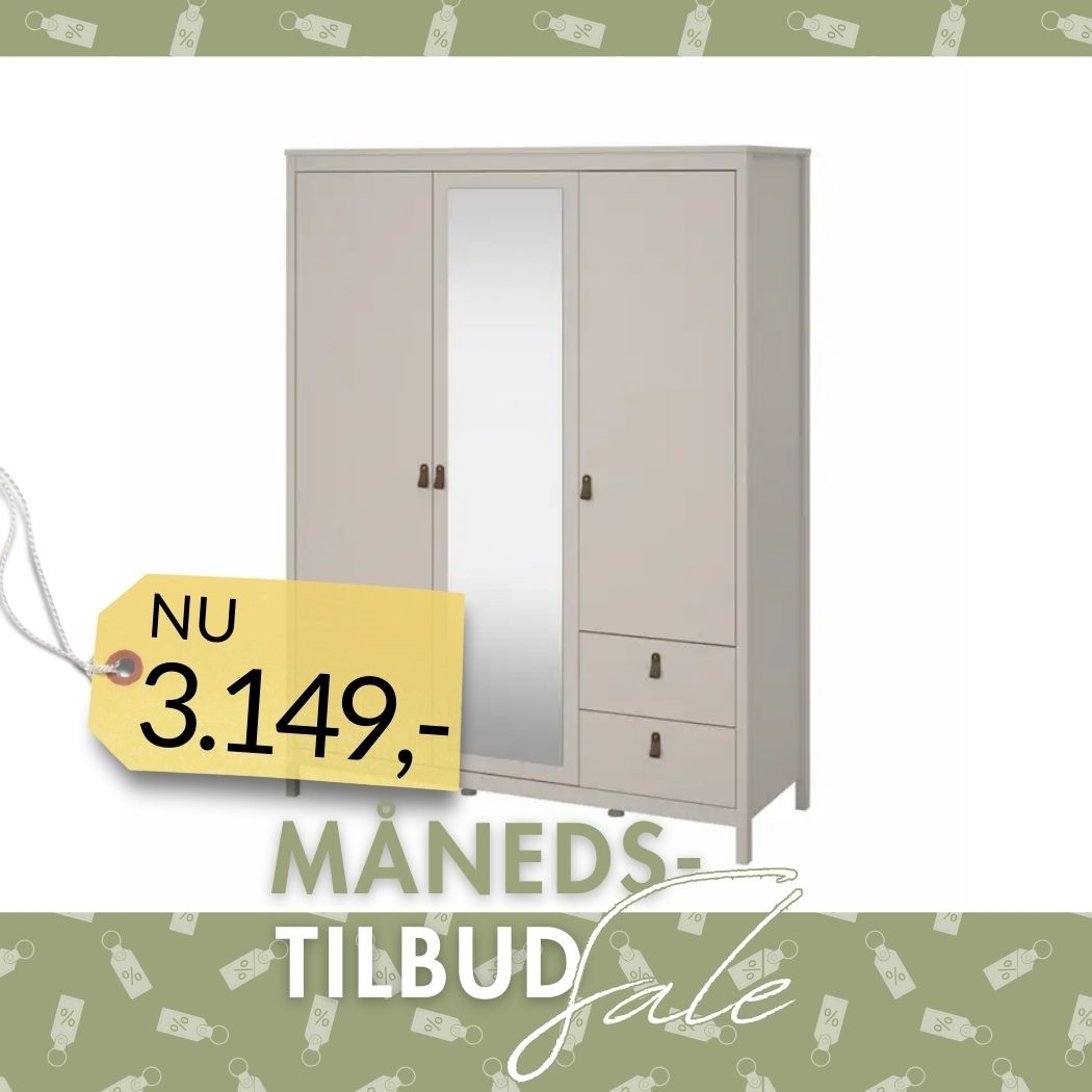 Denne Madrid garderobe er designet til at dække hverdagens opbevaringsbehov på en overskuelig måde. Garderoben er indrettet med tre døre, heraf én med spejl, to skuffer samt en kombination af hylder og garderobestang.