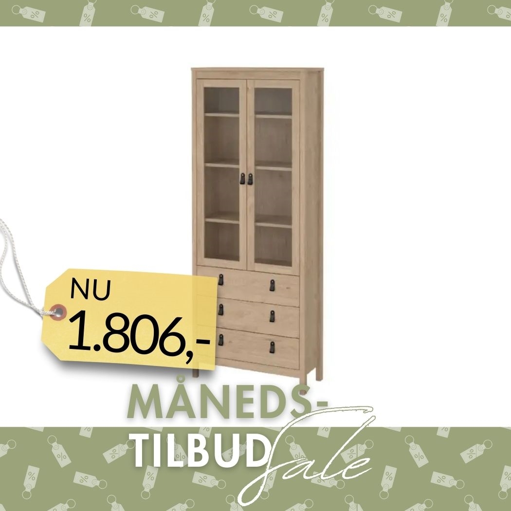Skabet indeholder tre faste hylder bag glaslågerne, perfekt til præsentation af dine fineste ejendele. Derudover har det tre rummelige skuffer, som giver dig ekstra plads til at organisere småting, service eller dokumenter.