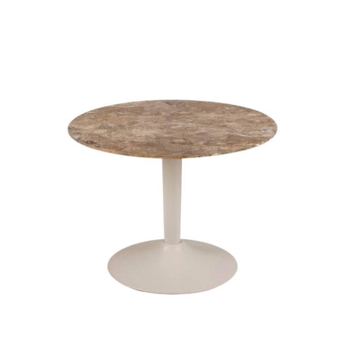Malta sofabord forener moderne design med klassiske materialer. Den elegante bordplade i brun Aberta poleret keramik giver sofabordet et luksuriøst udtryk, mens det solide grå trompetstel i pulverlakeret stål skaber en stabil og holdbar base. Bordets runde form gør det ideelt som samlingspunkt i stuen.