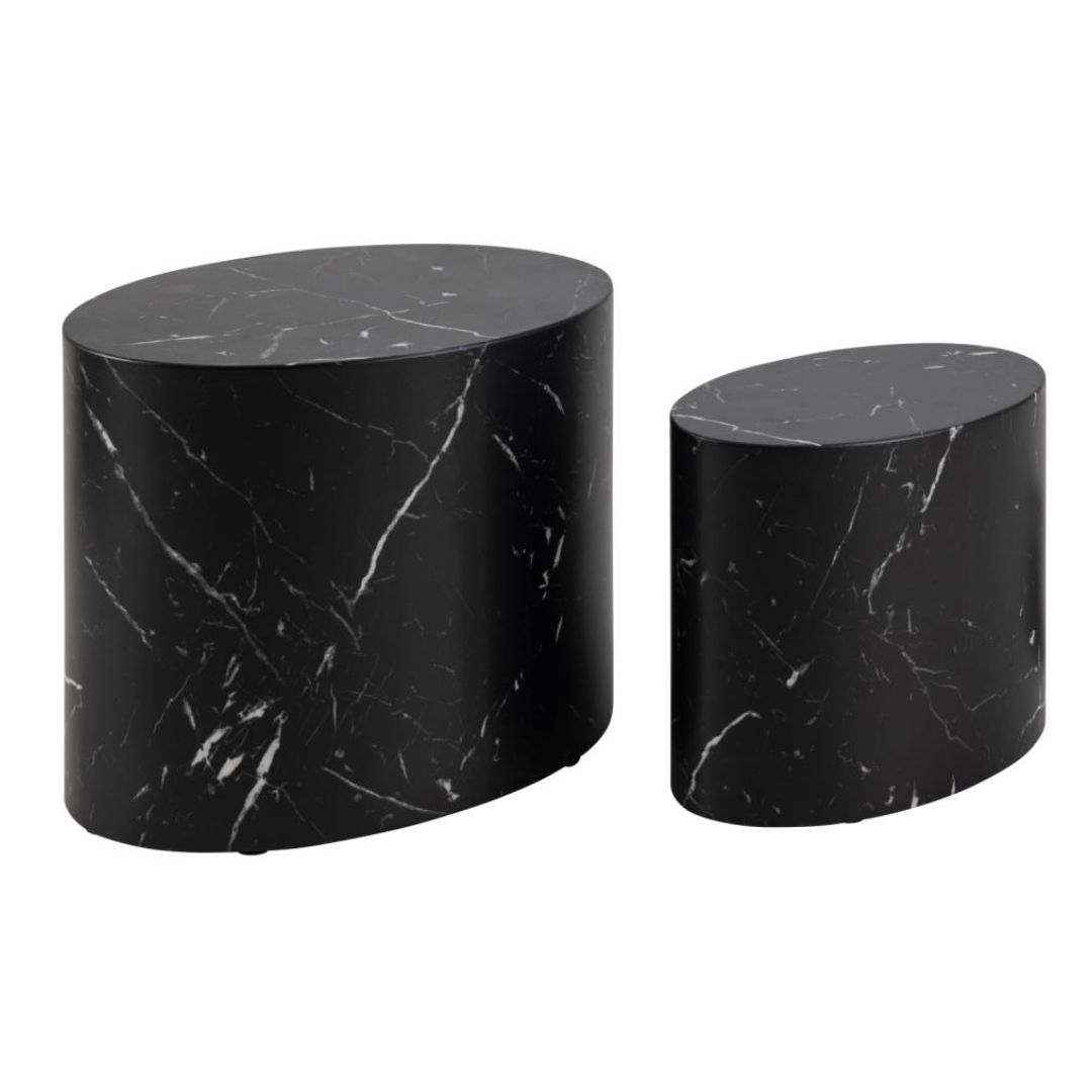 Mice ovalt sofabordssæt i sort Marquina marmorlook er et moderne og stilfuldt sæt bestående af 2 borde i forskellige størrelser. Med sin elegante mørke farve og organiske form tilfører sættet et eksklusivt og sofistikeret udtryk til din stue.