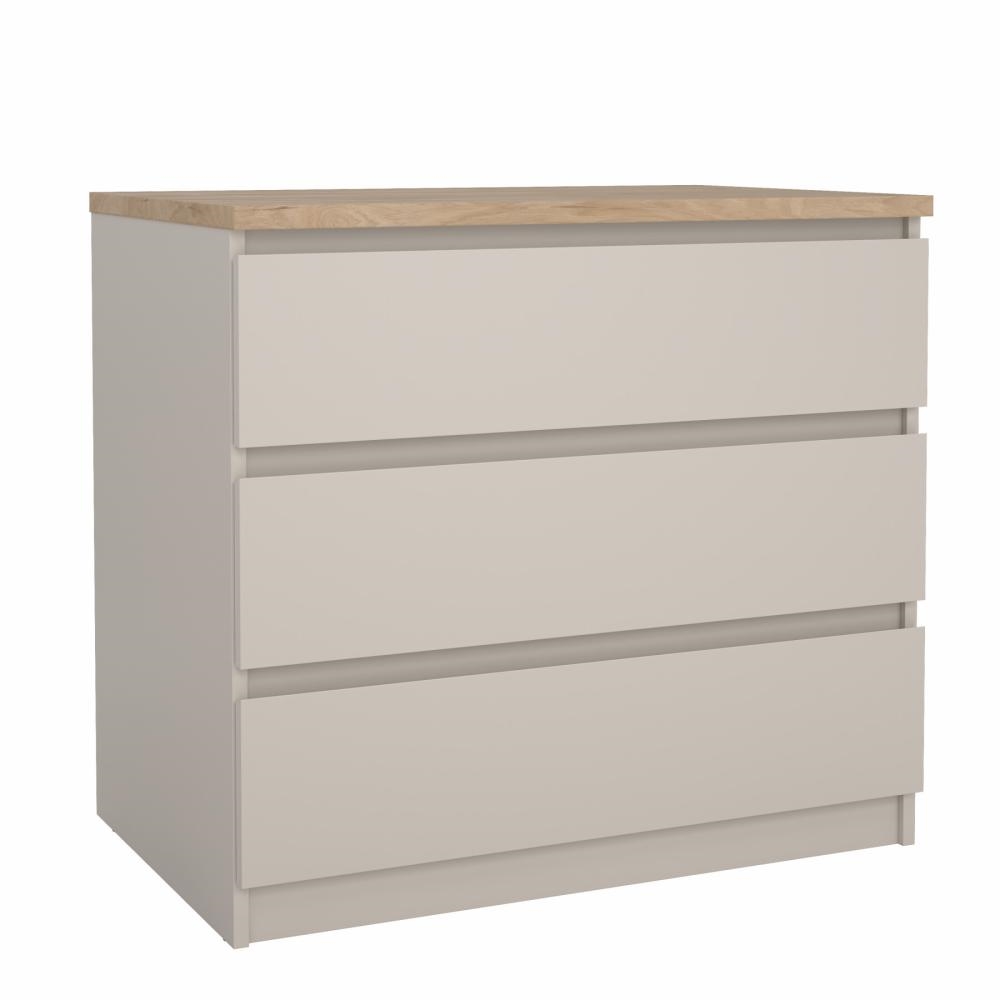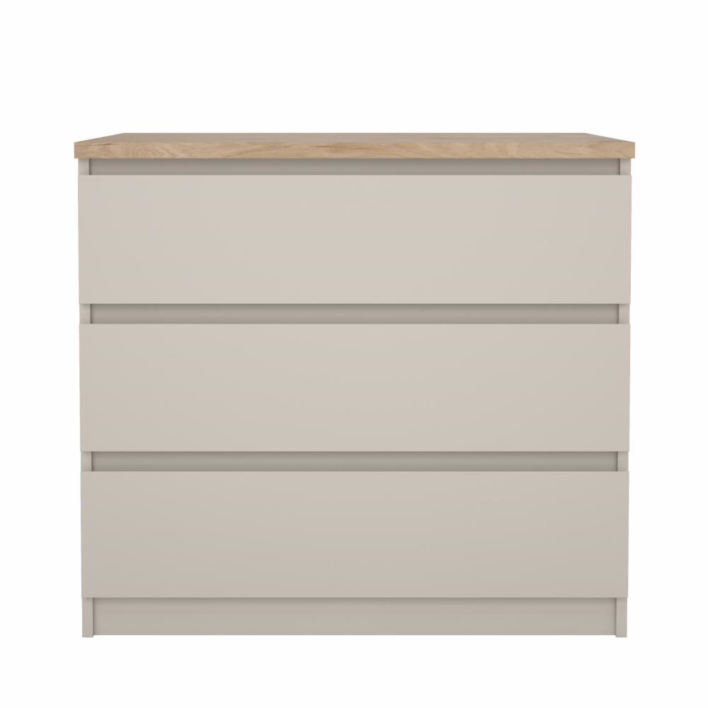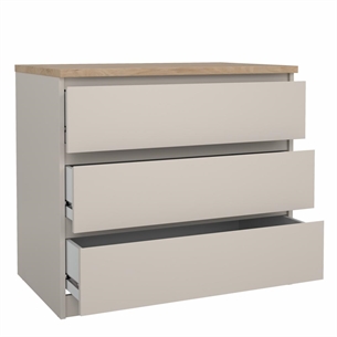Med Naia kommode med 3 skuffer får du et møbel, hvor funktionalitet og æstetik går hånd i hånd. Det grebsfri design, de letkørende skuffer og den afstemte farvekombination gør kommoden til et oplagt valg, hvis du ønsker orden og et moderne udtryk i hjemmet.