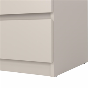 Naia kommoden er fremstillet i spånplade med folie, hvilket giver en solid konstruktion og en overflade, der er nem at vedligeholde. Det grebsfri design understøtter kommodens rene linjer og bidrager til et roligt og moderne helhedsindtryk.