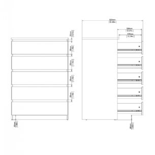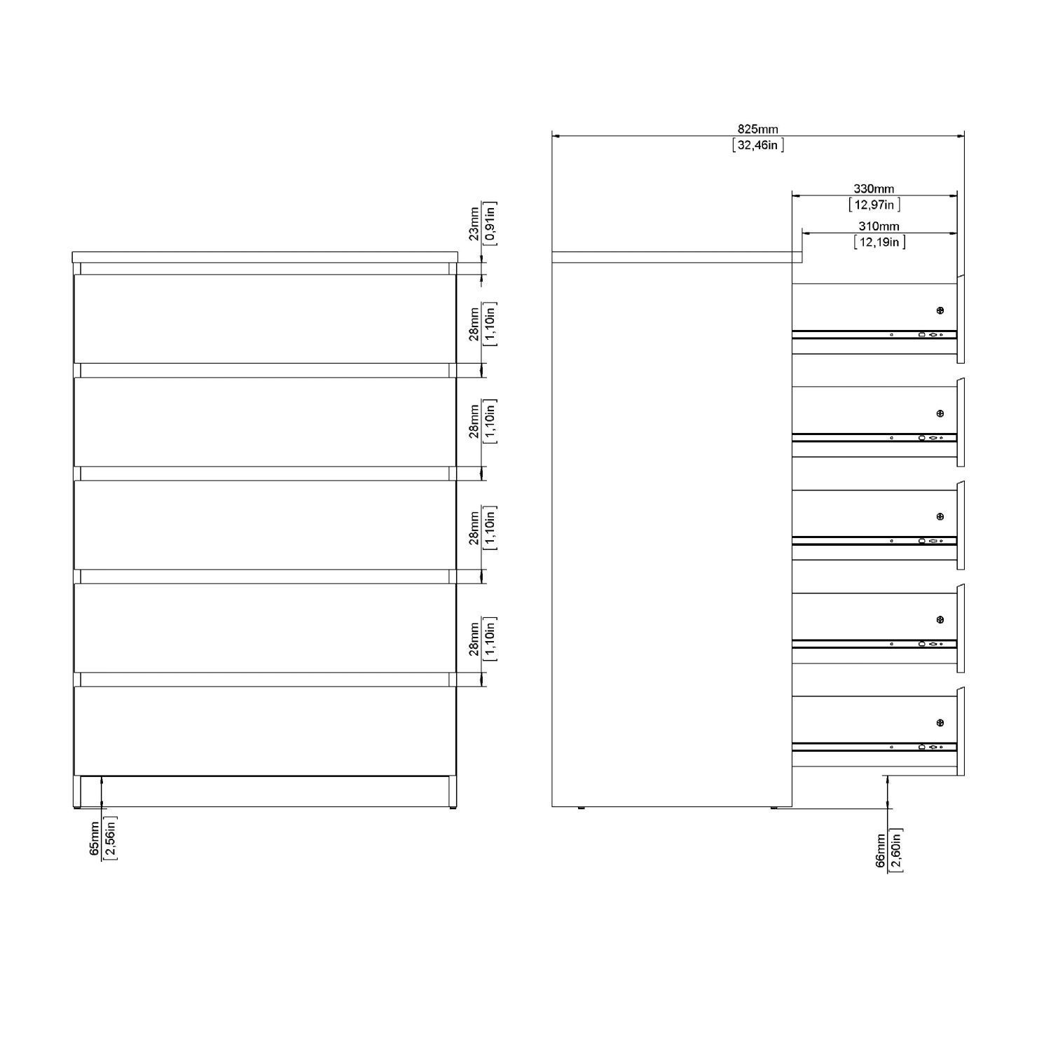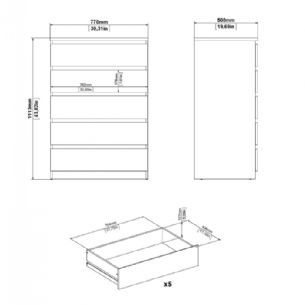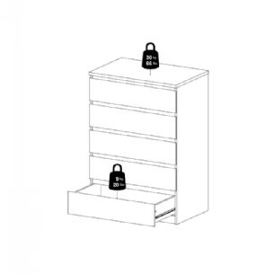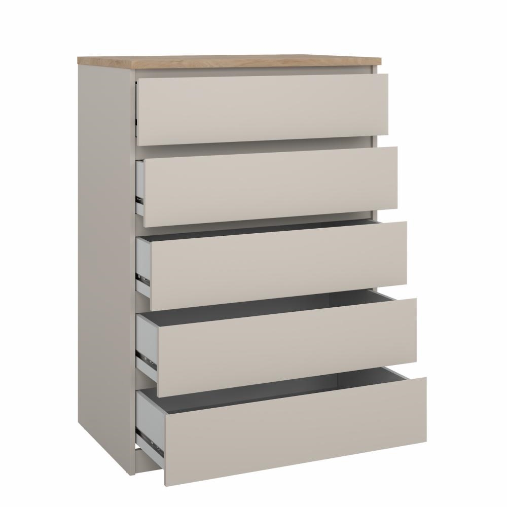 Denne Naia kommode er indrettet med fem rummelige skuffer, som giver god plads til opbevaring af tøj, tekstiler og andre hverdagsting. Skufferne er monteret med glatte stålskinner med kuglelejer, hvilket sikrer en behagelig og stabil åbne- og lukkefunktion i daglig brug.