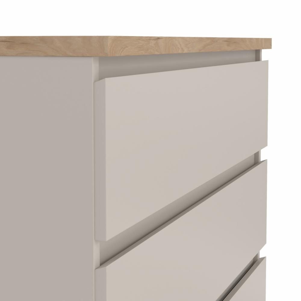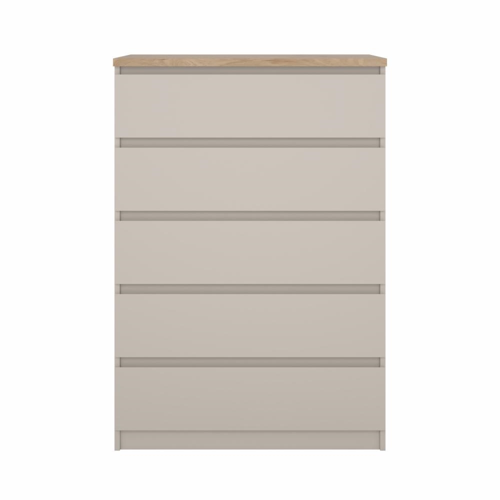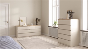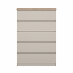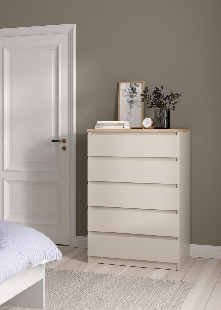 Med Naia kommode med 5 skuffer får du en opbevaringsløsning, hvor funktionalitet og æstetik går hånd i hånd. De letkørende skuffer, det grebsfri design og den afstemte farvekombination gør kommoden til et oplagt valg, hvis du ønsker orden og et moderne udtryk i boligen.