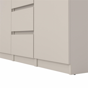 Naia skænken er fremstillet i spånplade med folie, hvilket sikrer en solid konstruktion og en overflade, der er nem at vedligeholde i hverdagen. Det grebsfri design understreger skænkens rene linjer og bidrager til et stilrent og sammenhængende helhedsindtryk.