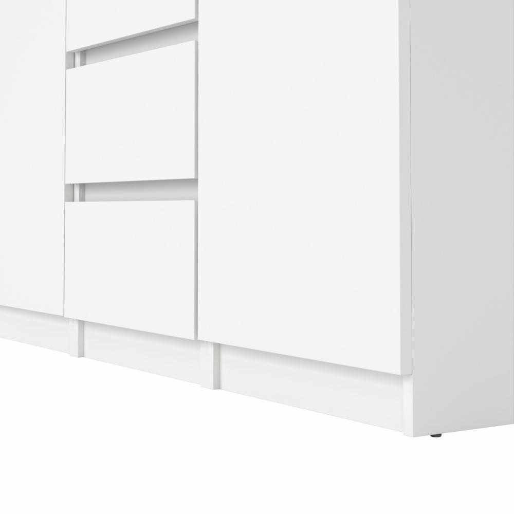 Skænken er fremstillet i slidstærk spånplade med melaminfolie, hvilket sikrer en solid konstruktion og en overflade, der er nem at vedligeholde i hverdagen. Den hvide finish understreger skænkens minimalistiske udtryk og gør den let at kombinere med både lyse og mørke møbler.