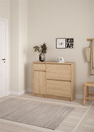 Med sin kompakte dybde og funktionelle opbygning er Naia skoskabet ideelt til entré, gang eller bryggers, hvor pladsen skal udnyttes optimalt. Det varme trælook giver samtidig rummet et hyggeligt og indbydende udtryk.