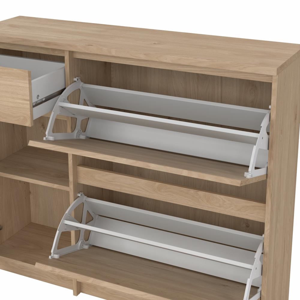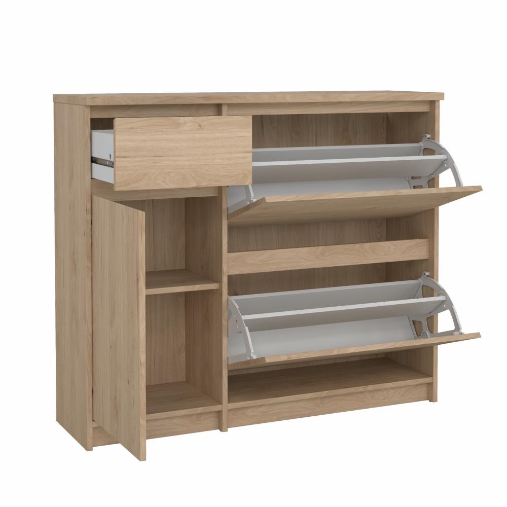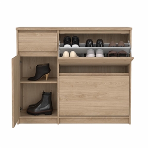 Dette Naia skoskab er indrettet med to vippelåger, som giver praktisk og overskuelig opbevaring af sko. Derudover har skabet et lukket rum med en hylde samt en rummelig skuffe, som giver ekstra opbevaringsmuligheder til accessories, skopleje eller andre småting.