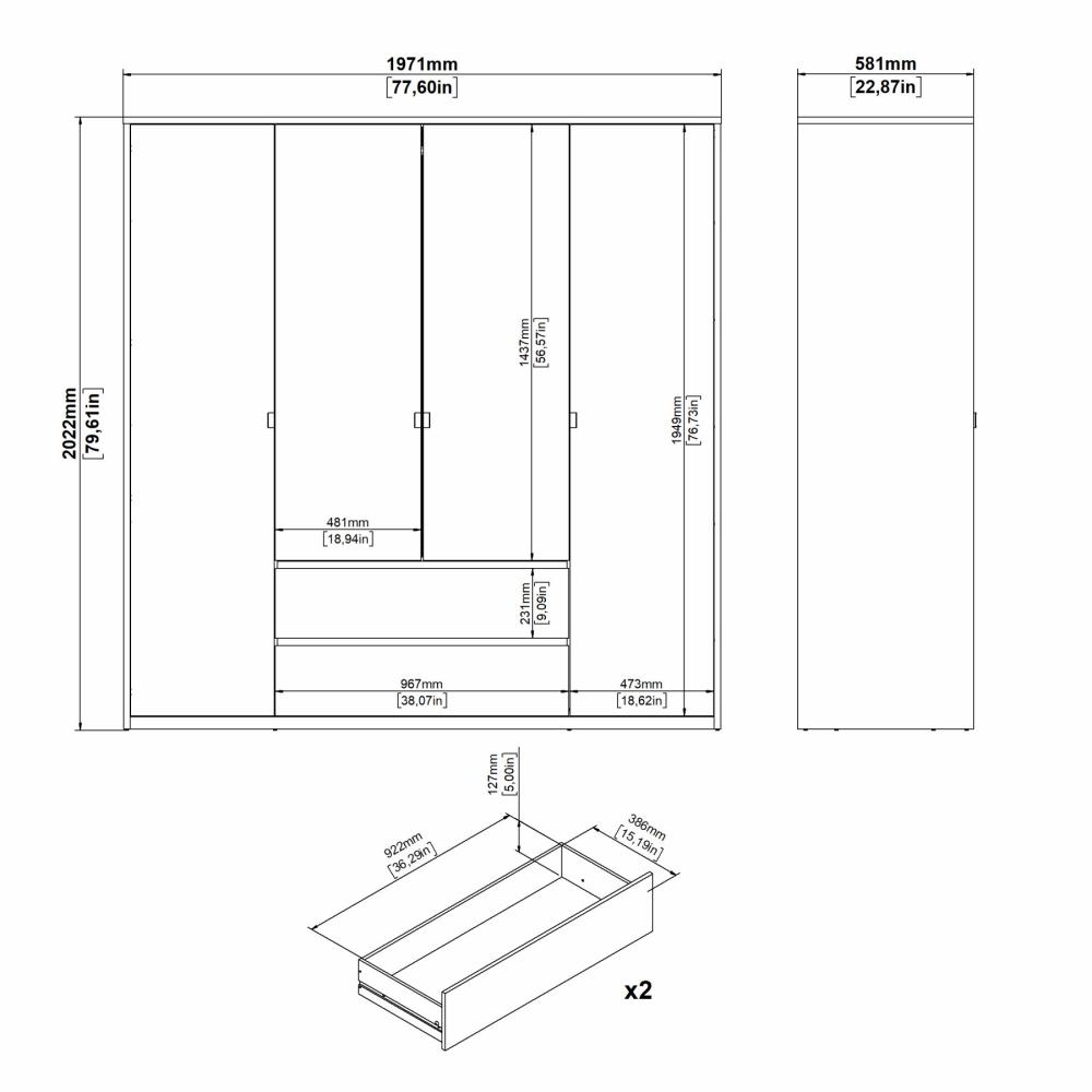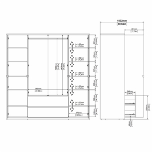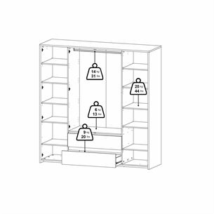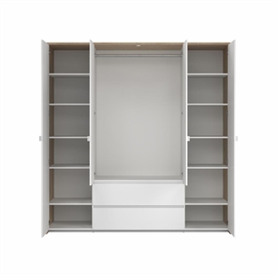 Denne Next garderobe er designet til dig, der har behov for maksimal opbevaringsplads. Garderoben er indrettet med fire døre, to skuffer og hele elleve hylder, hvoraf ti er justerbare og én er fast. Det giver dig stor frihed til at tilpasse indretningen efter dine behov – uanset om du ønsker mere hængeplads, flere hylder eller en kombination af begge dele.