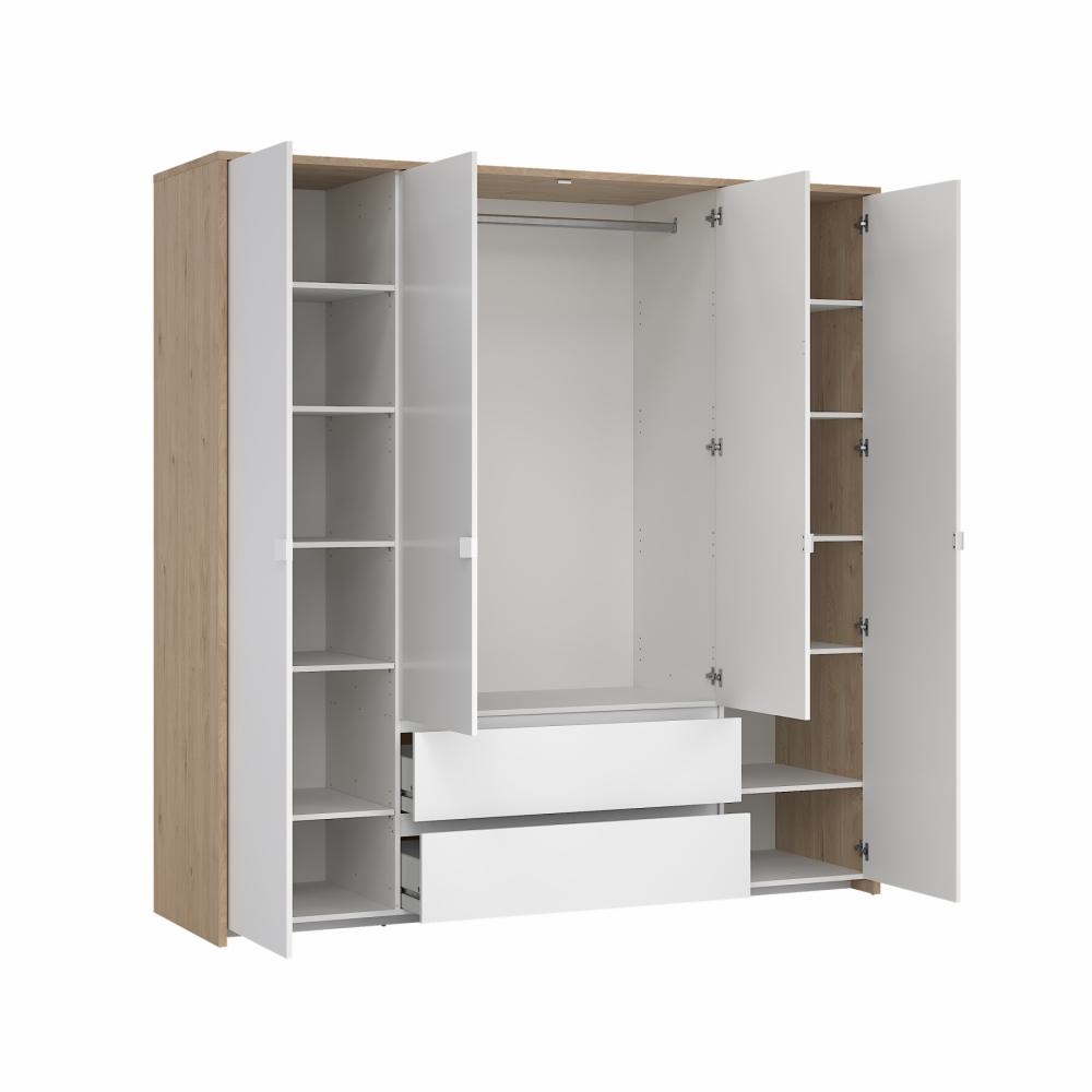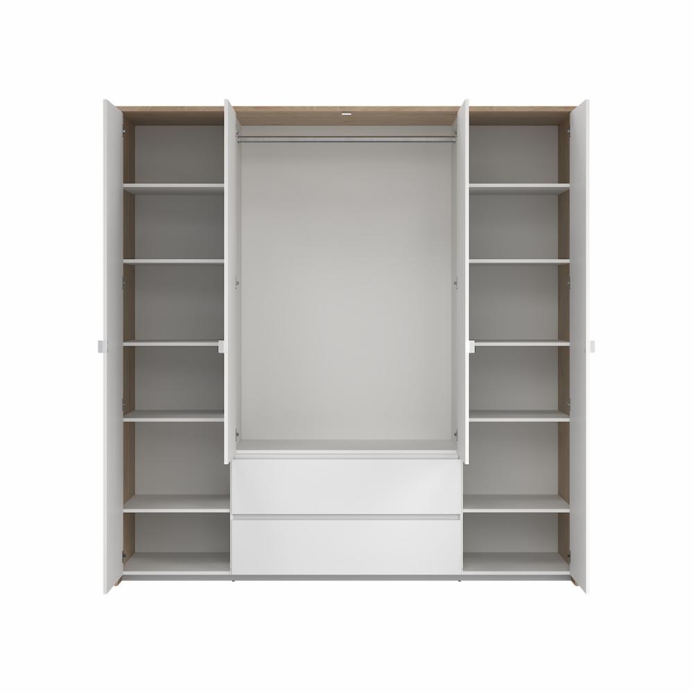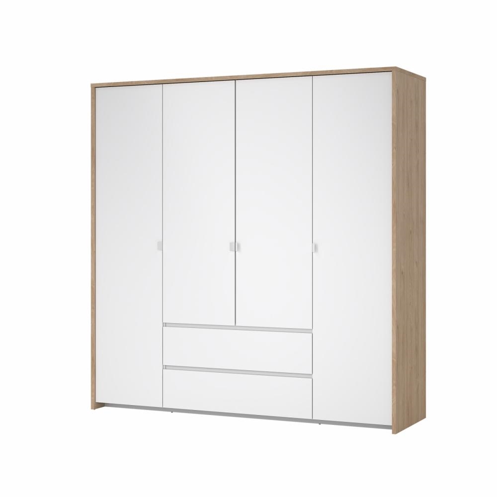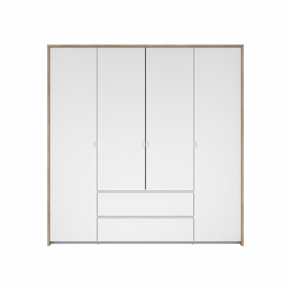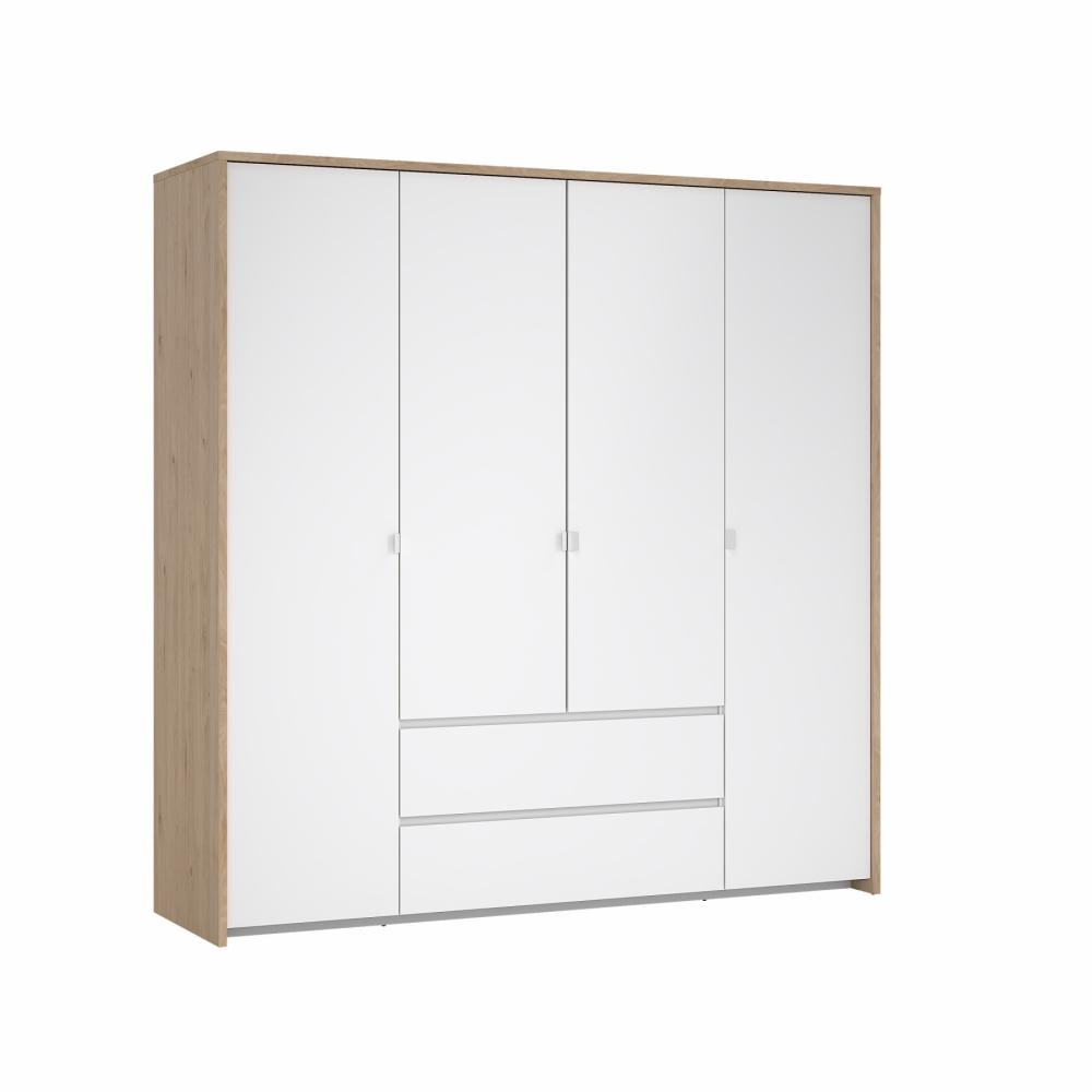 Next garderobe med 4 døre og 2 skuffer i Jackson Hickory og hvid højglans er en rummelig og elegant garderobeløsning, der kombinerer varme trætoner med et moderne og eksklusivt udtryk. Den stilfulde farvesammensætning gør garderoben til et naturligt omdrejningspunkt i soveværelset, hvor både design og funktionalitet er i fokus.