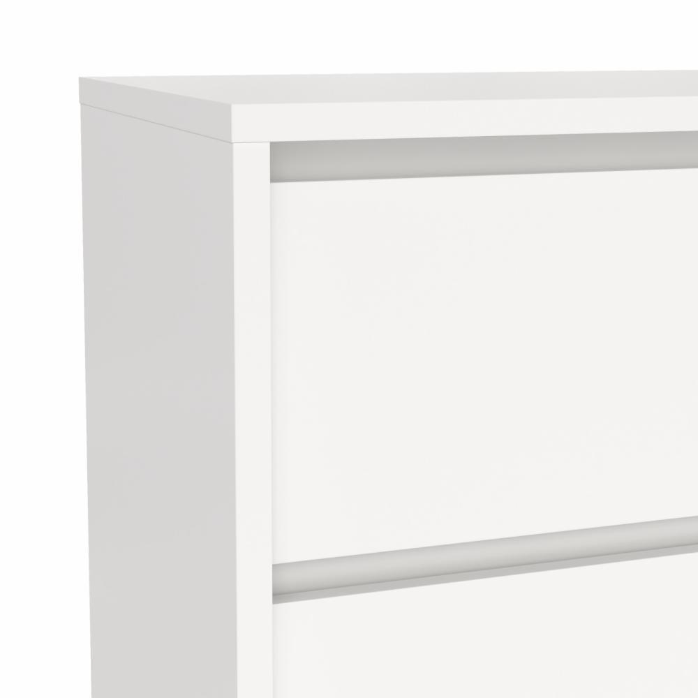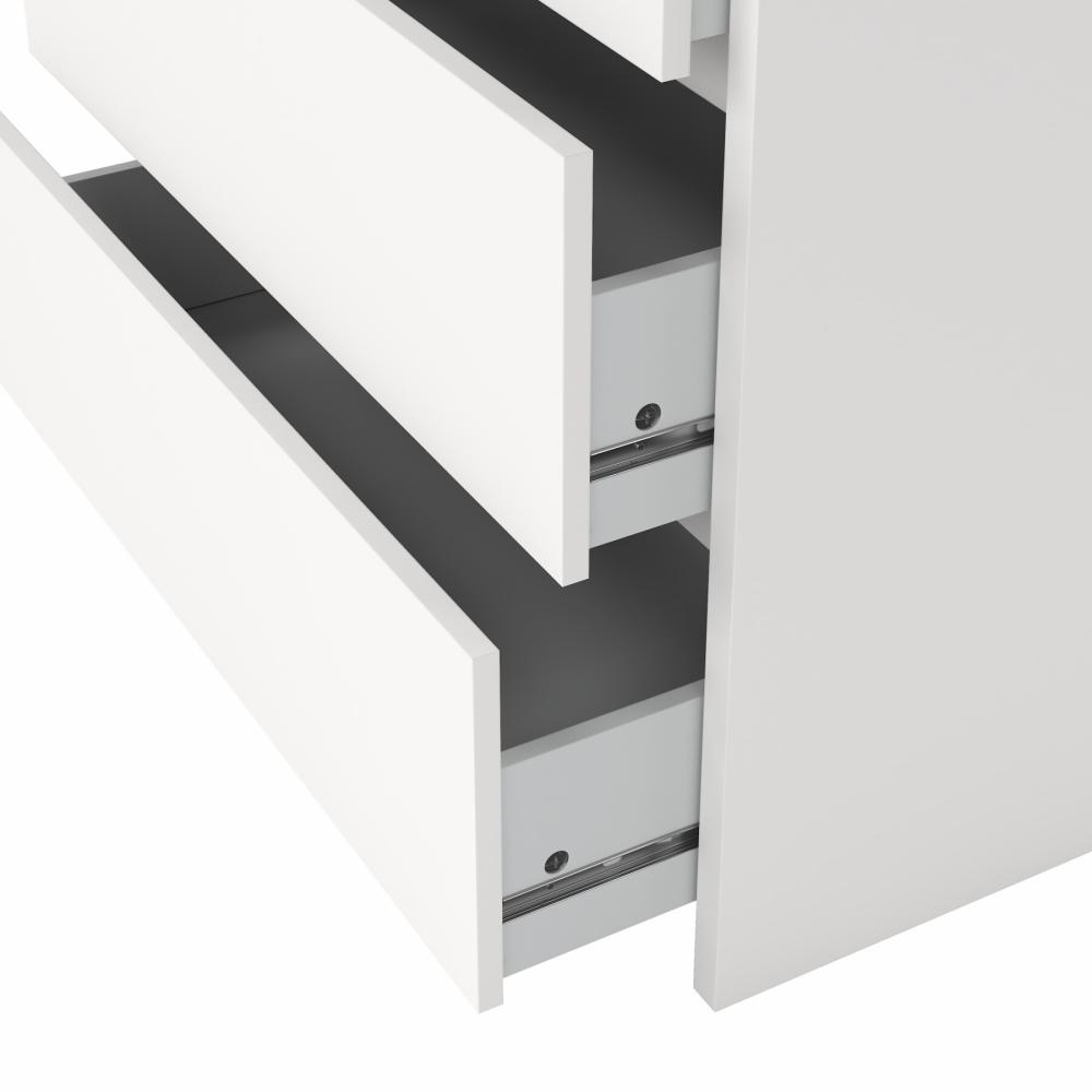 Kommoden er fremstillet i spånplade med folie, hvilket giver en robust og slidstærk overflade, der er nem at vedligeholde i dagligdagen. Den hvide farve understreger det minimalistiske udtryk og bidrager til et let og moderne look i rummet.