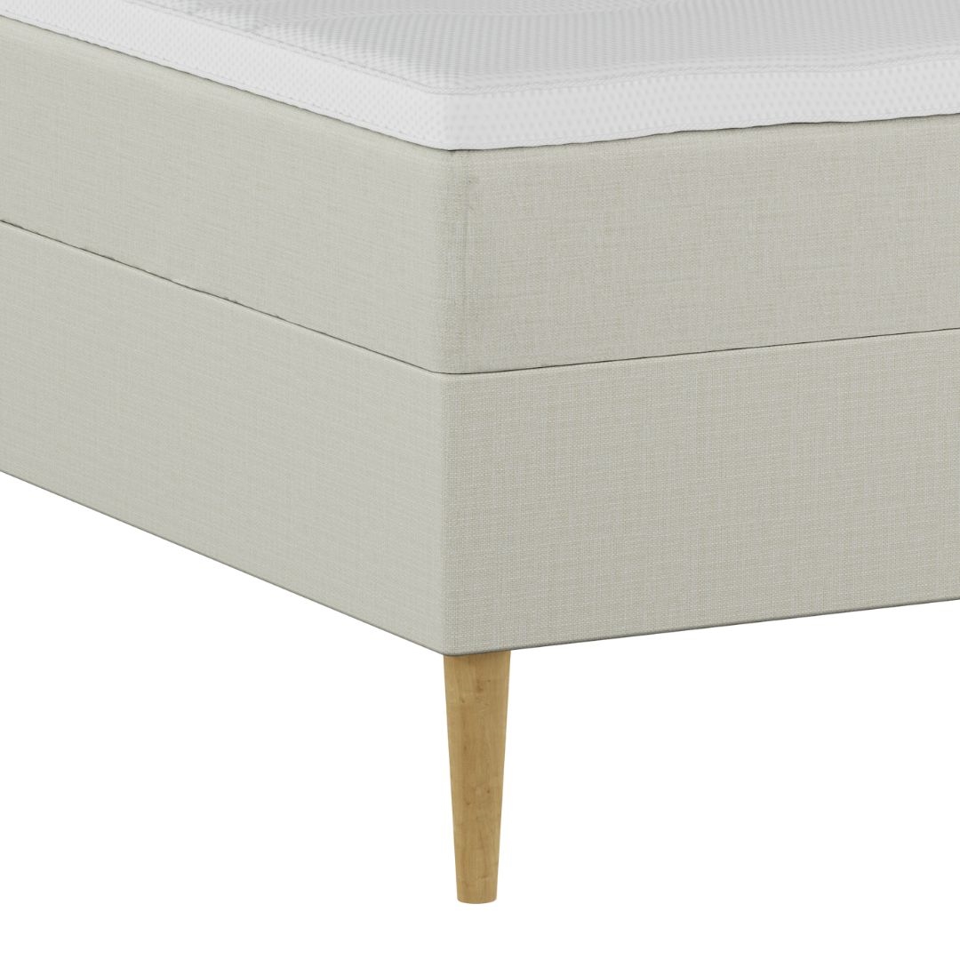 Det sandfarvede møbeltekstil giver sengen et lyst og indbydende udtryk, som passer perfekt ind i skandinaviske soveværelser. Farven bidrager til en rolig atmosfære og er let at kombinere med både lyse og mørke nuancer i indretningen. Sammen med egebenene opnår sengen et let, harmonisk og moderne look.