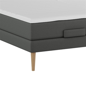 Det mørke antracittekstile fremhæver sengens stilrene linjer og giver en elegant og eksklusiv atmosfære i soveværelset. Stoffet er slidstærkt, farvefast og udvalgt til daglig brug, mens de lyse 19 cm egeben giver et nordisk og let udtryk.