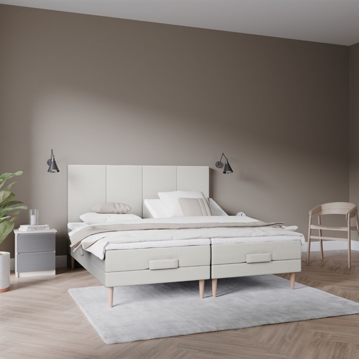 Nordic Heaven Essential elevationsseng med Urban sengegavl i sand er skabt til dig, der ønsker maksimal komfort, fleksibilitet og et mere eksklusivt udtryk i soveværelset. Her får du en komplet sengeløsning, hvor elevation, komfort og design er samlet i én gennemtænkt løsning.