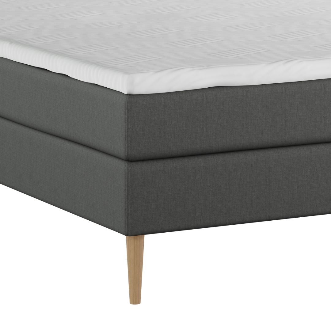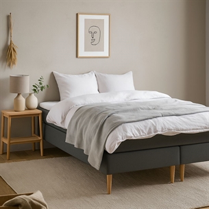 Den mørke antracitfarve giver kontinentalsengen et elegant, dybt og moderne udtryk. Farven er tidløs, let at kombinere med andre materialer og skaber en rolig stemning i rummet. Det slidstærke møbeltekstil er udviklet til at holde sin struktur og farve, selv ved daglig brug. Sammen med de 19 cm egeben får sengen en lethed og et nordisk formsprog, som passer perfekt i moderne danske hjem.
