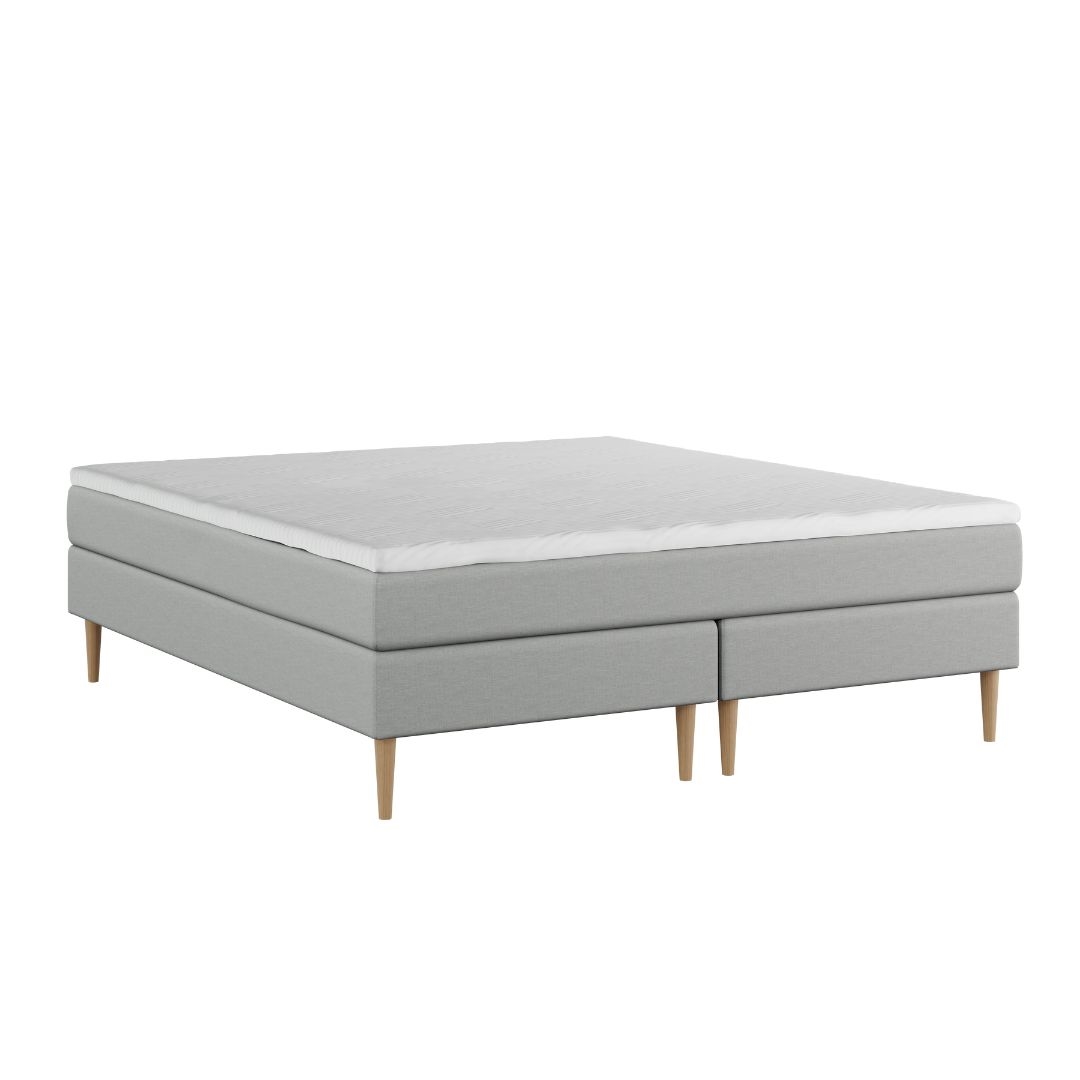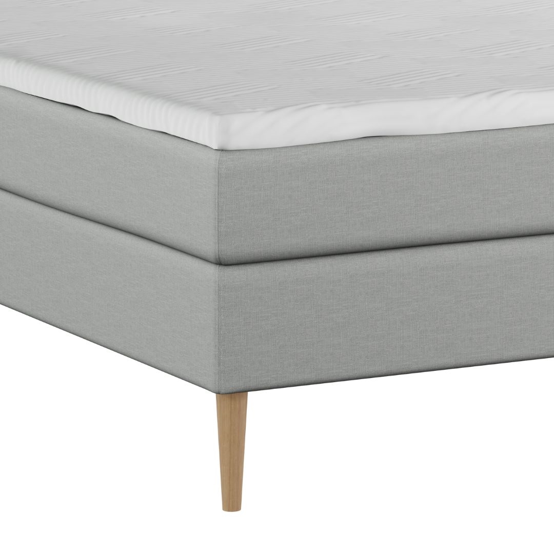 Med sit lysgrå tekstil får denne Essential kontinentalseng et lyst og harmonisk formsprog, der er nemt at indrette rundt om. Farven tilfører soveværelset en rolig balance og gør rummet både større og mere indbydende at se på. Kontinentalsengens karakteristiske lagdelte design fremhæves af det ensartede tekstil fra top til bund, og kombinationen med de lyse 19 cm egeben giver et flot, let og stilfuldt udtryk.