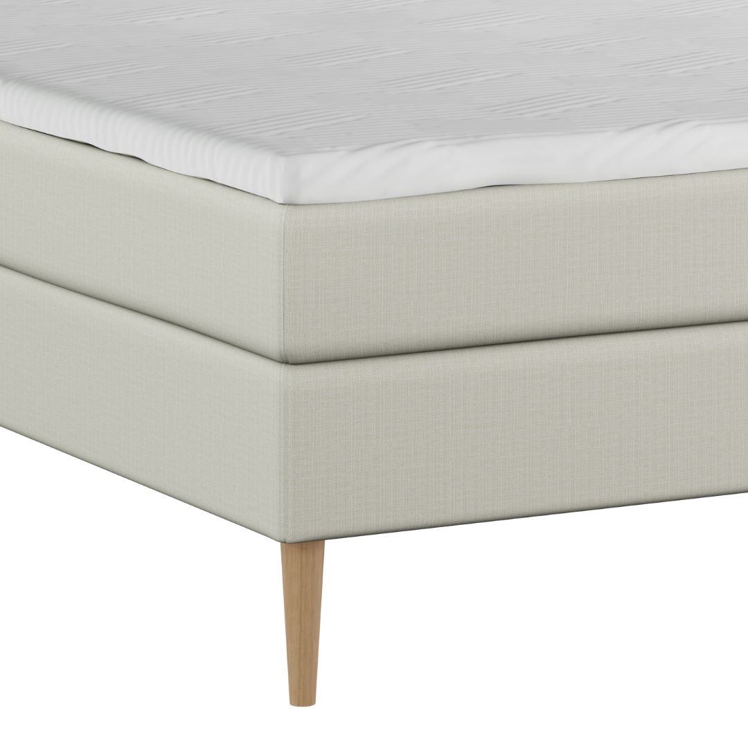Den sandfarvede tekstilbeklædning giver sengen et varmt og naturligt udtryk og passer perfekt til både moderne og klassiske soveværelser. Tekstilet er slidstærkt og farveægte, hvilket betyder, at sengen holder sit smukke udtryk i mange år. De lyse egeben løfter desuden sengen visuelt og giver et let, nordisk udtryk.