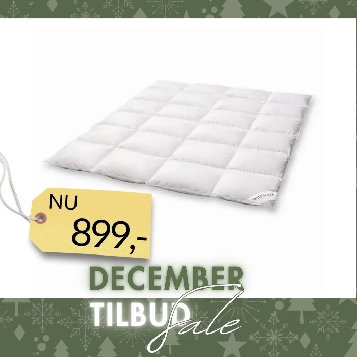 Dynen kan vaskes ved op til 60°C, men skånsom vask ved 30–40°C anbefales for at beskytte dunenes naturlige olier. Tør dynen i tørretumbler med tennisbolde for at genskabe volumen og bevare fyldets luftige struktur.