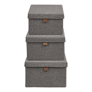 Noto opbevaringskasser er et praktisk og stilrent sæt bestående af tre opbevaringskasser i mørkegråt stof. Kasserne er designet til at skabe orden i hverdagen og passer perfekt til opbevaring i reoler, skabe eller på hylder, hvor funktionalitet og et roligt udtryk er i fokus.
