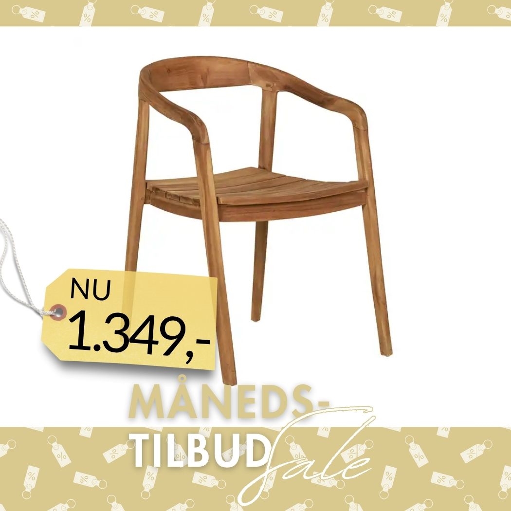 For at bevare teaktræets smukke naturlige farve anbefales det at behandle stolen med teakolie et par gange om året. Ønskes en patineret sølvgrå overflade, kan stolen blot stå uden behandling og udvikle en naturlig patina over tid.
