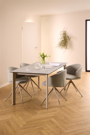 Spisebordet står på et stærkt stel i gråt, ru pulverlakeret stål, der giver en solid base og et minimalistisk look. Farven matcher perfekt bordpladen og skaber et harmonisk, tone-i-tone udtryk, der passer ind i både moderne og industrielle indretninger.