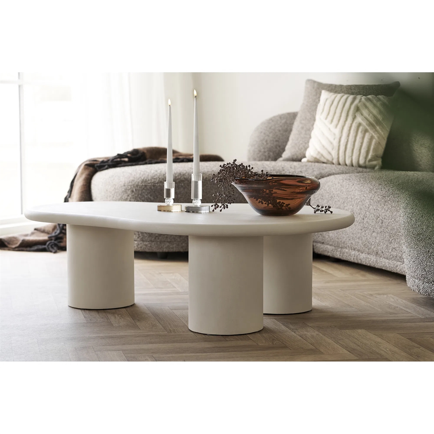 Forestil dig, hvordan dette sofabord vil blive et centralt element i din stue. Den cementlignende overflade og lysegrå farve giver bordet et unikt og stilfuldt udseende, der tilføjer både funktion og æstetik til dit hjem. Brug det som et praktisk møbel til daglig brug, eller som et dekorativt element, der tilfører karakter og elegance til din stue.