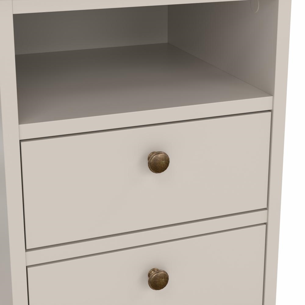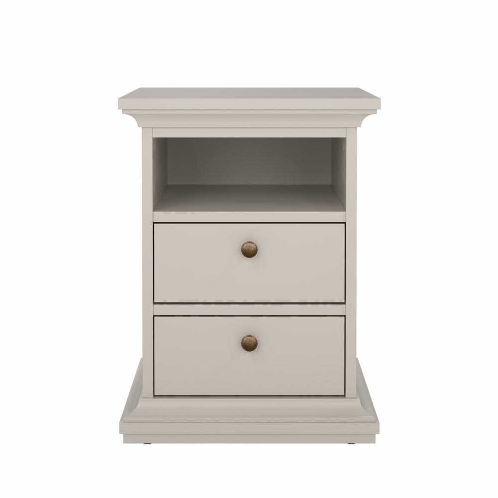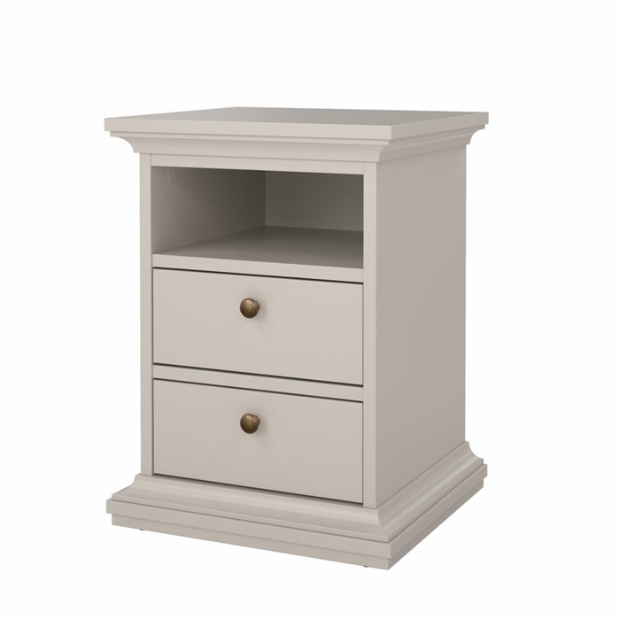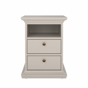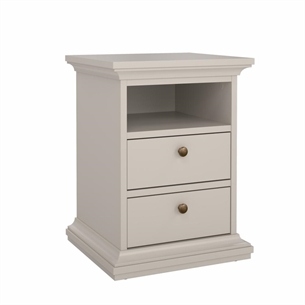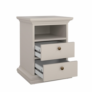 Dette Paris sengebord er indrettet med to rummelige skuffer samt et åbent rum øverst. Skufferne giver plads til opbevaring af mindre genstande som opladere, briller og personlige ejendele, mens det åbne rum er ideelt til bøger, magasiner eller dekorative elementer.