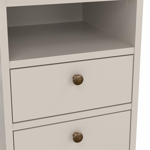 Paris sengebordet er fremstillet i spånplade med folie, hvilket giver en solid konstruktion og en overflade, der er nem at vedligeholde i dagligdagen. Det landlige design med klassiske detaljer tilfører sengebordet karakter og gør det til et stemningsskabende møbel i soveværelset.