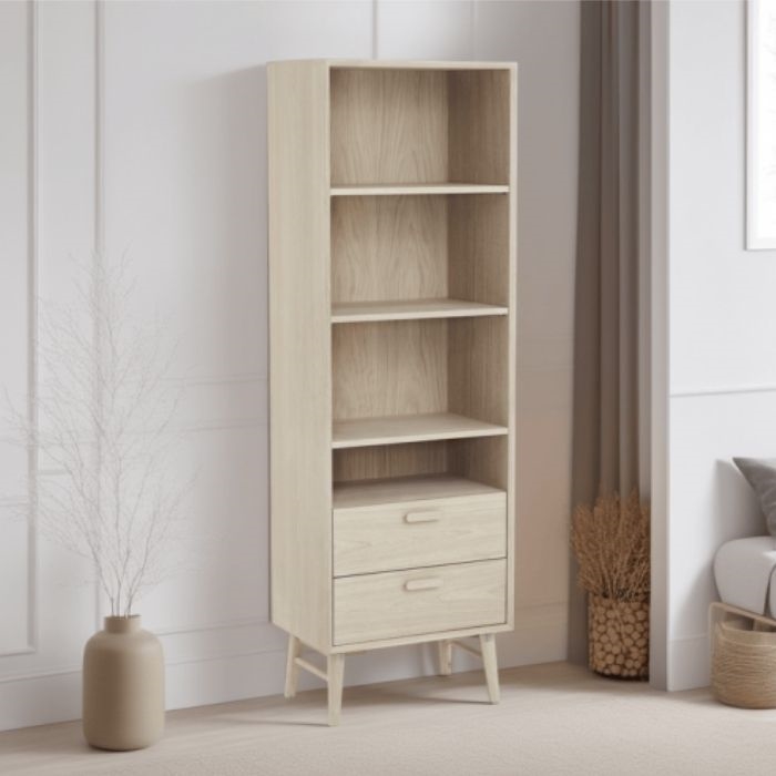 Porto bogreolens enkle og stilfulde design gør det nemt at integrere den i både moderne og klassiske indretninger. De tre åbne hylder giver masser af plads til opbevaring af bøger, dekorationer eller personlige samlinger, mens de to skuffer giver ekstra opbevaringsmuligheder til småting. Det bløde-lukkende system gør det nemt at bruge skufferne uden støj, og de rustikke træhåndtag giver et smukt finish. Den kompakte størrelse gør den ideel til stuen, soveværelset eller kontoret.