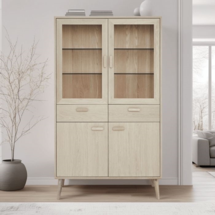 Porto vitrineskab er fremstillet af massivt træ, egefiner og MDF, hvilket giver både holdbarhed og stil. Den hvide oliebehandlede egefiner giver skabet et lyst og elegant udseende, samtidig med at træets naturlige årer fremhæves. De fire glasdøre med blød-lukkefunktion sikrer, at dine genstande er beskyttet mod støv, samtidig med at de giver et åbent og elegant udtryk. De dæmpbare LED-lys skaber den ønskede belysning og stemning i rummet.