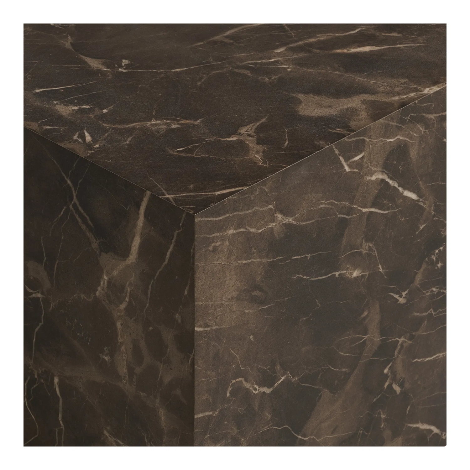 Bordpladen er fremstillet i MDF beklædt med dekorpapir i brun marmor-look, der skaber en realistisk og varm overflade. Dette materiale kræver minimal vedligeholdelse, så du får det luksuriøse marmorudtryk uden det tunge og sarte naturmateriale. Stellet i træ giver en stabil base, som fuldender bordets stilrene udtryk.