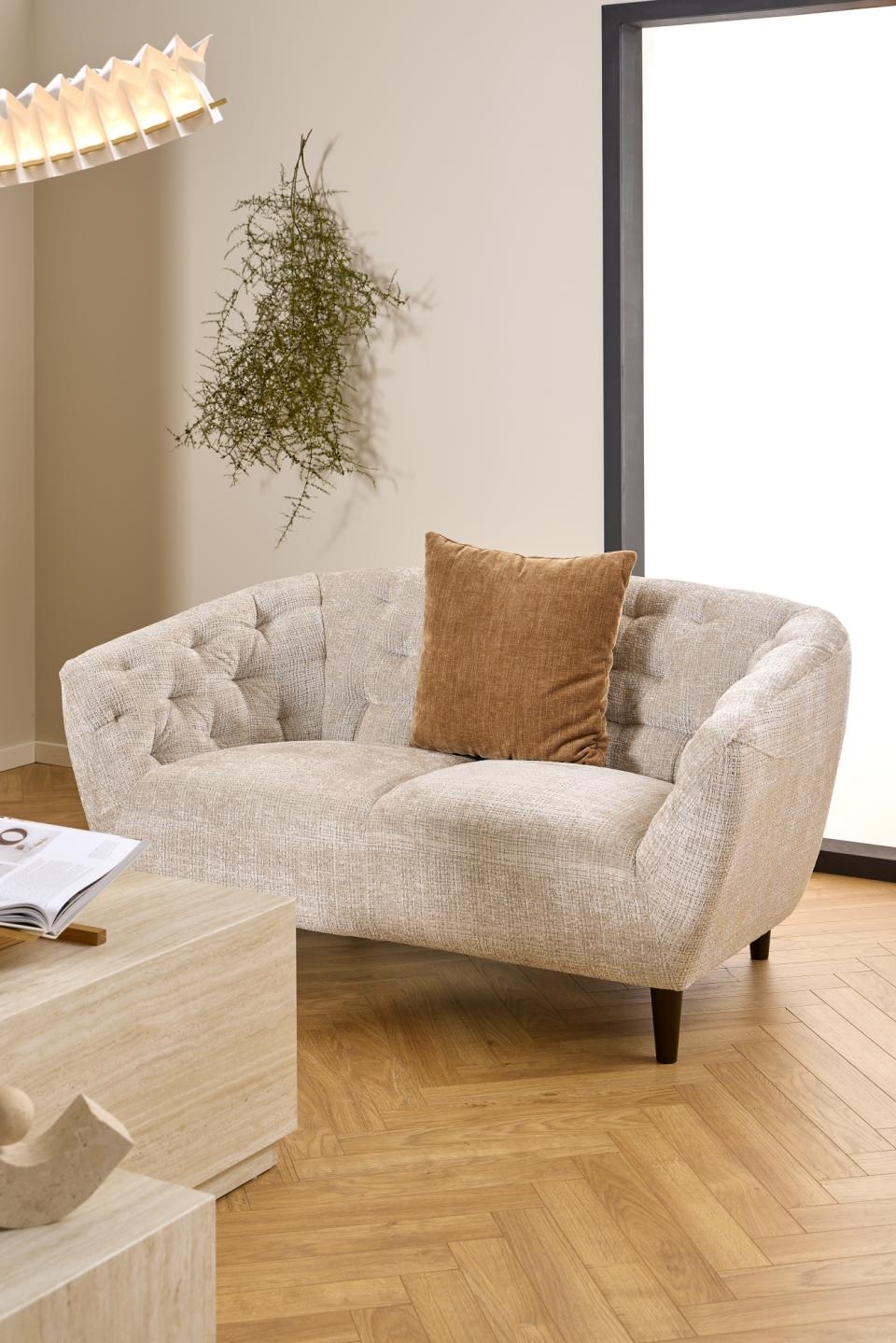 Ria 2-personers sofa i beige Juto stof er en stilren og komfortabel sofa, der kombinerer moderne design med høj siddekomfort. Med sit lyse udtryk og elegante detaljer er sofaen et oplagt valg til både små og mellemstore stuer.