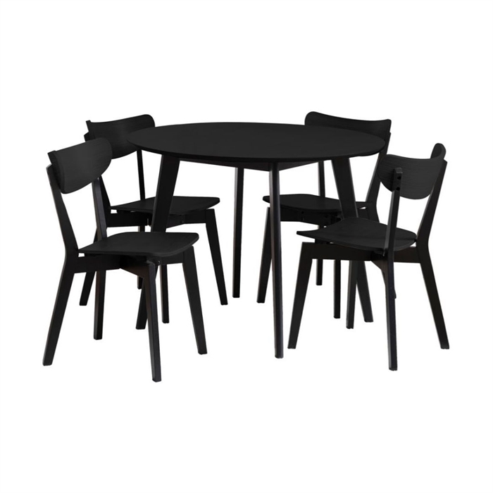 Roxby rundt spisebordssæt Ø105 cm i sort med 4 stole er et moderne og stilrent sæt, der passer perfekt til både små og mellemstore spiseområder. Den runde form og det elegante sorte design skaber en indbydende og social spiseplads.