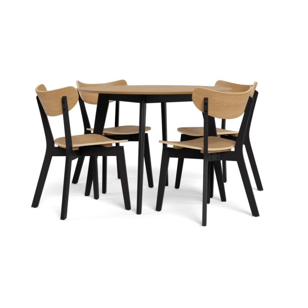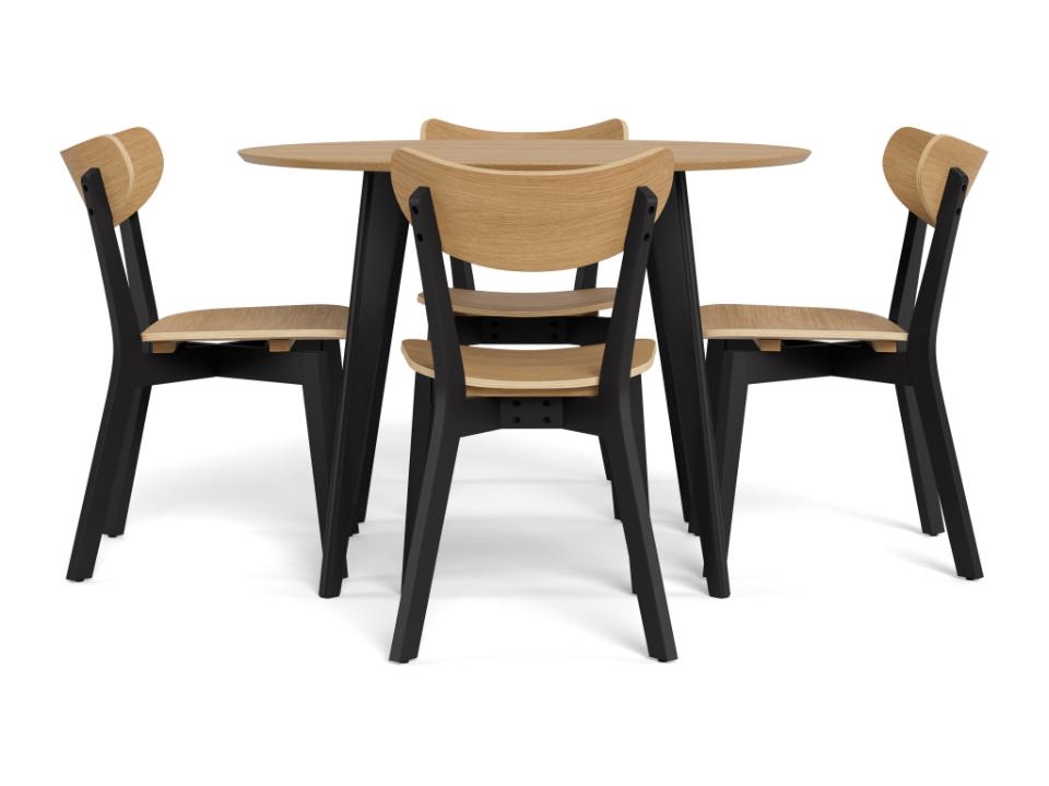 Roxby rundt spisebordssæt Ø105 cm i eg med 4 stole er et stilrent og funktionelt sæt, der kombinerer naturlige materialer med et moderne design. Den varme træbordplade og det sorte stel skaber en flot kontrast, som passer perfekt ind i skandinaviske hjem.