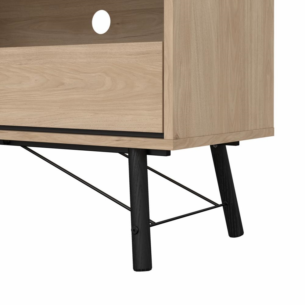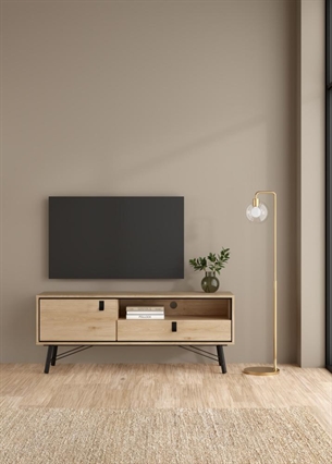 Dette Ry TV-møbel kombinerer lukket og åben opbevaring på en praktisk måde. Den rummelige skuffe er ideel til fjernbetjeninger, kabler og småting, mens lågen skjuler de ting, du gerne vil have gemt væk. Det åbne rum med fast hylde giver nem adgang til spillekonsoller, medieafspillere eller andet elektronisk udstyr.