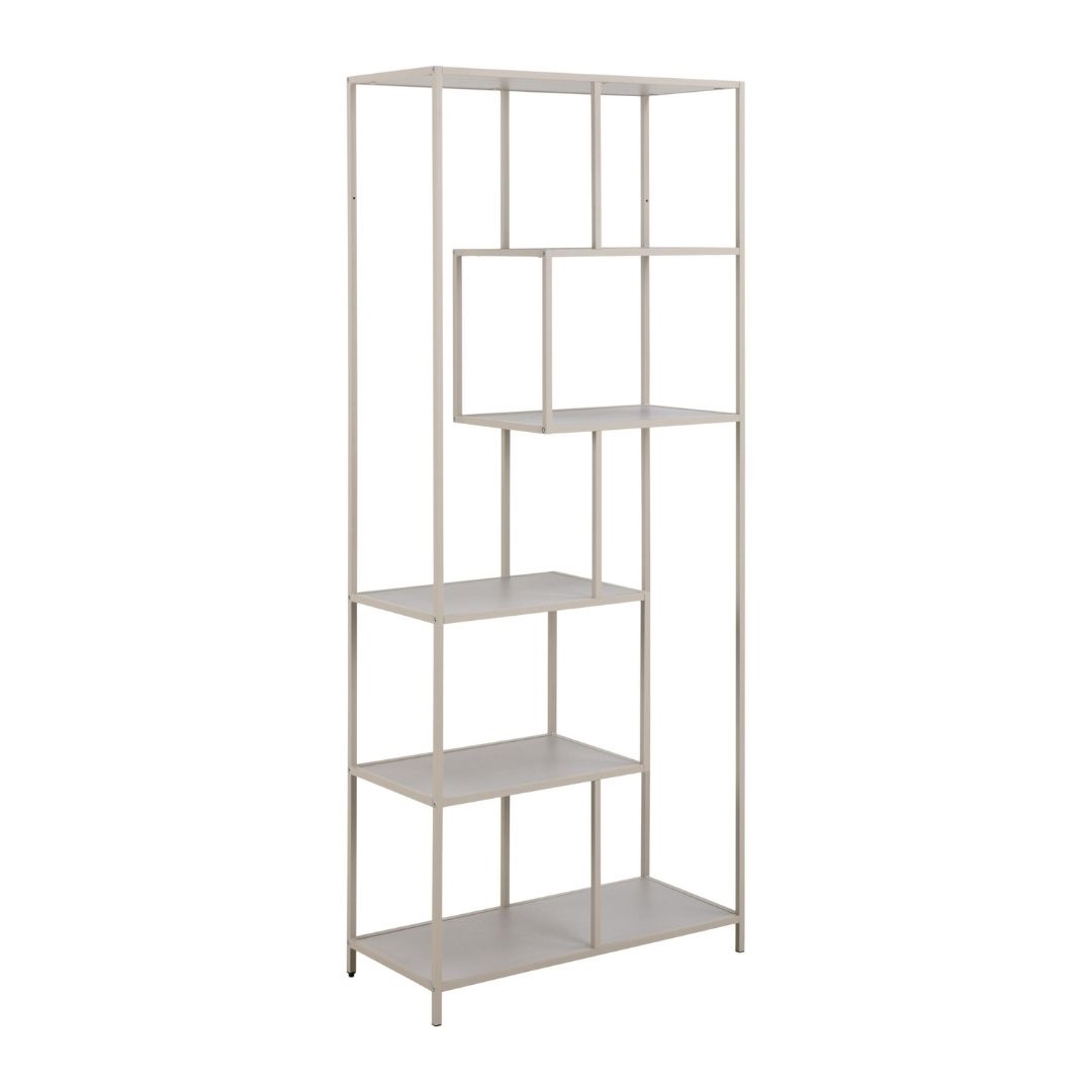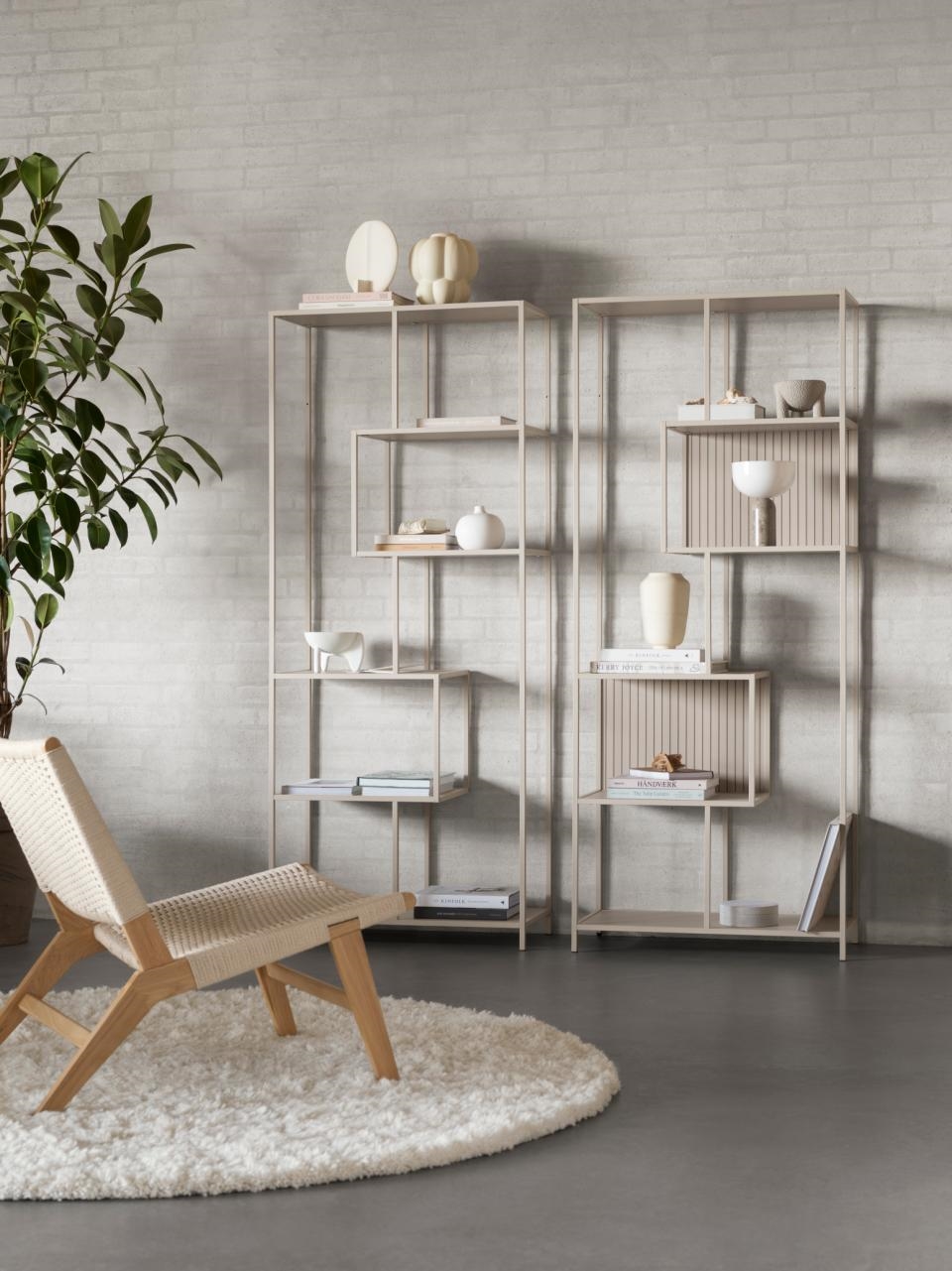 Reolen er designet med en asymmetrisk opsætning af hylder, som skaber et dynamisk og moderne udtryk. Den åbne konstruktion gør det nemt at fremvise bøger, planter og dekorationer.