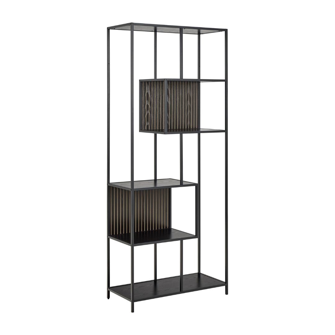 Seaford reol 77x185 cm i sort med asymmetrisk design er en stilren og funktionel reol, der kombinerer moderne design med praktisk opbevaring. Den høje og slanke form gør den ideel til både små og større rum, hvor du ønsker maksimal udnyttelse af pladsen.