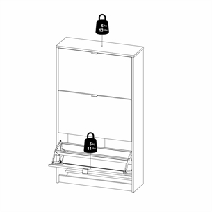 Dette skoskab er indrettet med tre separate rum med vippelåger, som giver en praktisk og overskuelig opbevaringsløsning til sko. Hvert rum er opdelt i to lag, hvilket giver ekstra opbevaringsplads og gør det muligt at organisere fodtøj effektivt.