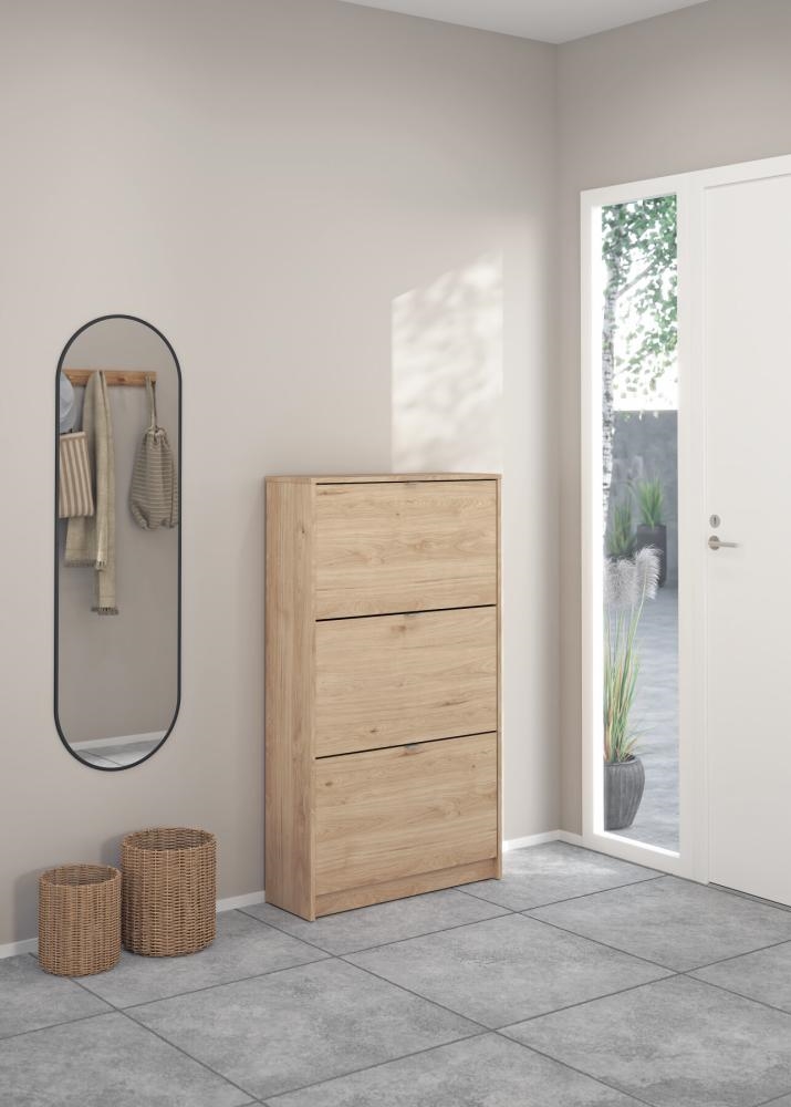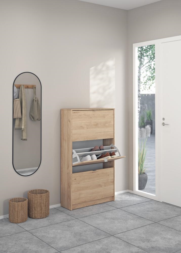 Skoskab med 3 vippelåger er skabt til dig, der ønsker en effektiv og stilren løsning til skoopbevaring. Den gennemtænkte opbygning og det elegante trælook gør skoskabet til et praktisk og dekorativt valg i hverdagen.