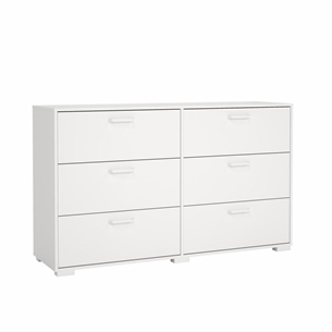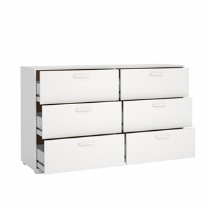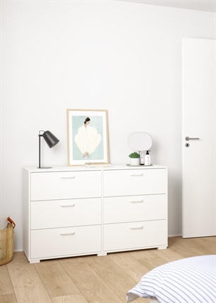 Denne dobbelt kommode er ideel til dig, der har behov for rummelig opbevaring, men samtidig ønsker et møbel, der fremstår roligt og harmonisk i indretningen. Med seks skuffer fordelt i en bred opbygning får du god plads til organisering af tøj, tekstiler og hverdagens nødvendigheder.