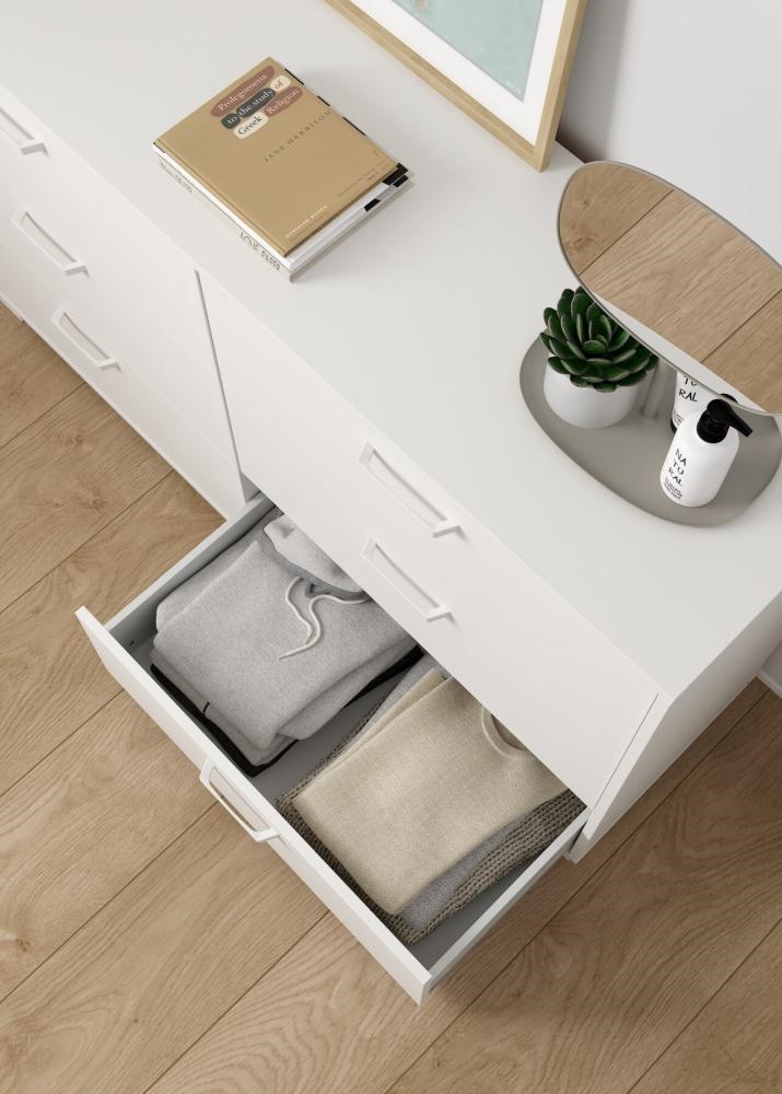 Den solide skuffemekanisme betyder, at skufferne føles stabile og lette at betjene, også når de er fyldt, hvilket bidrager til kommodens høje funktionalitet.