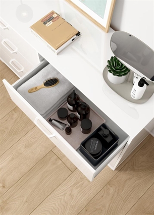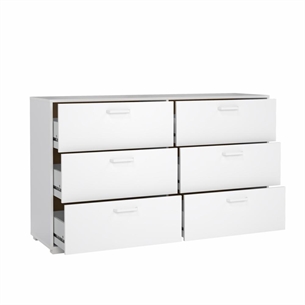 Sofia dobbeltkommode med 6 skuffer er skabt til dig, der ønsker effektiv opbevaring i et moderne og stilrent design. De letkørende skuffer, den elegante højglansoverflade og de gennemførte detaljer gør kommoden til et funktionelt og visuelt stærkt valg i hverdagen.
