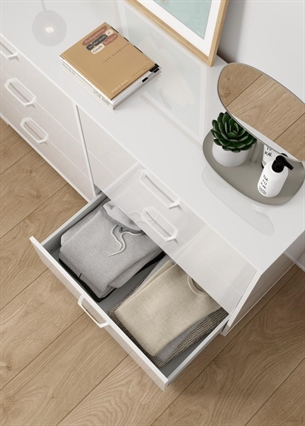 Sofia dobbeltkommoden er fremstillet i spånplade med folie, hvilket giver en solid konstruktion og en overflade, der er nem at rengøre og vedligeholde. Den hvide højglansfinish reflekterer lyset og bidrager til et lyst og moderne udtryk i rummet.