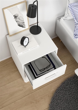 Sengebordet er udstyret med to rummelige skuffer, der giver praktisk opbevaringsplads til hverdagens nødvendigheder. Her kan du nemt opbevare bøger, briller, opladere, notesbøger eller andre personlige ejendele, som du gerne vil have tæt på sengen.