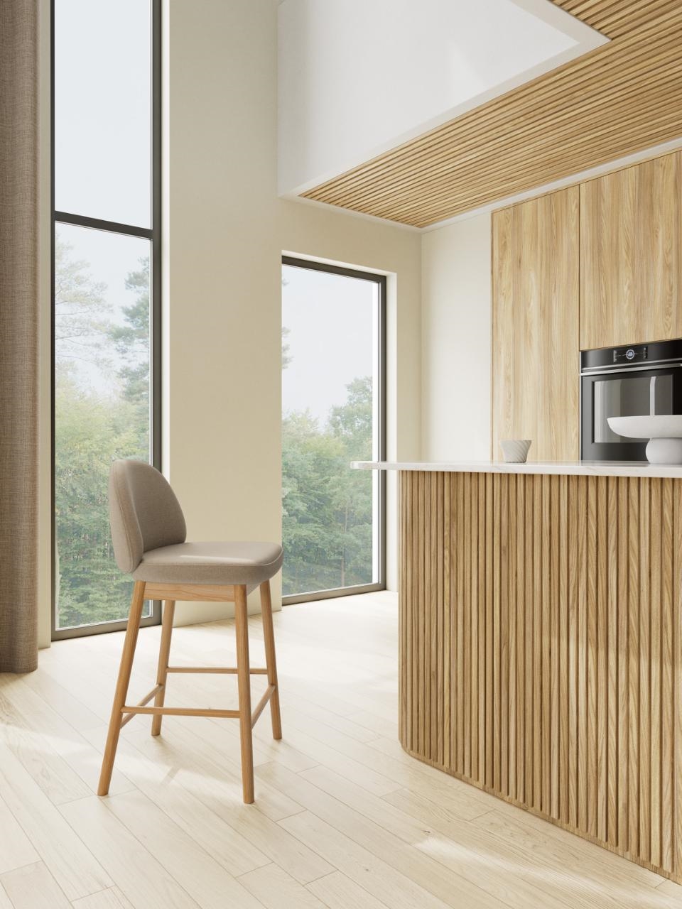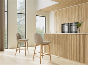 Det tekstile betræk tilfører varme til indretningen og gør barstolen velegnet til daglig brug, hvor komfort spiller en vigtig rolle – uanset om det er til morgenkaffen, hurtige måltider eller hyggelige stunder ved køkkenøen.