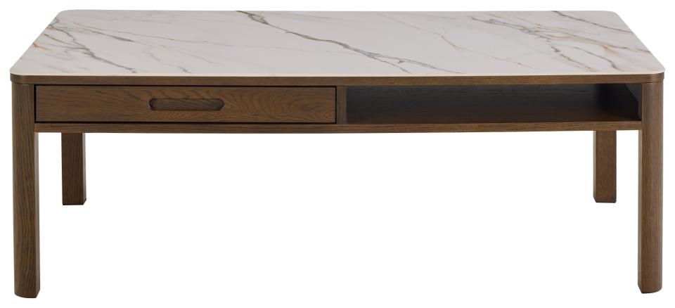 Dette sofabord er ikke kun flot – det er også praktisk. Det er udstyret med en integreret skuffe og skjult opbevaring, perfekt til fjernbetjeninger, magasiner eller småting, du ønsker af vejen. Derudover har bordet et åbent rum, der er ideelt til dekorative elementer eller bøger.