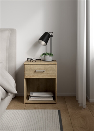 Dette sengebord er designet med en rummelig skuffe og en åben hylde, så du nemt kan opbevare både personlige genstande og dekorative elementer. Skuffen glider let på stabile skinner, hvilket gør det nemt at opbevare småting uden rod. Den åbne hylde giver ekstra plads til bøger, elektronik eller andre ting, du ønsker lige ved hånden.