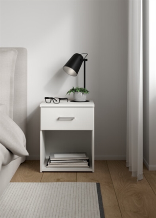 Det tidløse og enkle design i hvid gør sengebordet let at kombinere med forskellige senge og indretningsstile. De rene linjer og minimalistiske udtryk giver et moderne og stilrent look, der tilfører elegance til dit soveværelse.